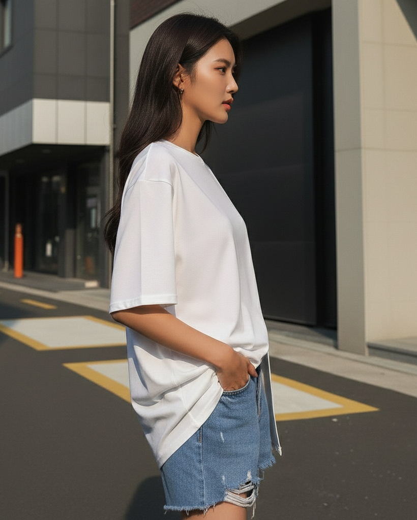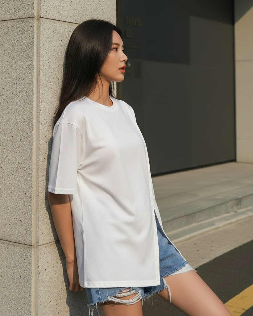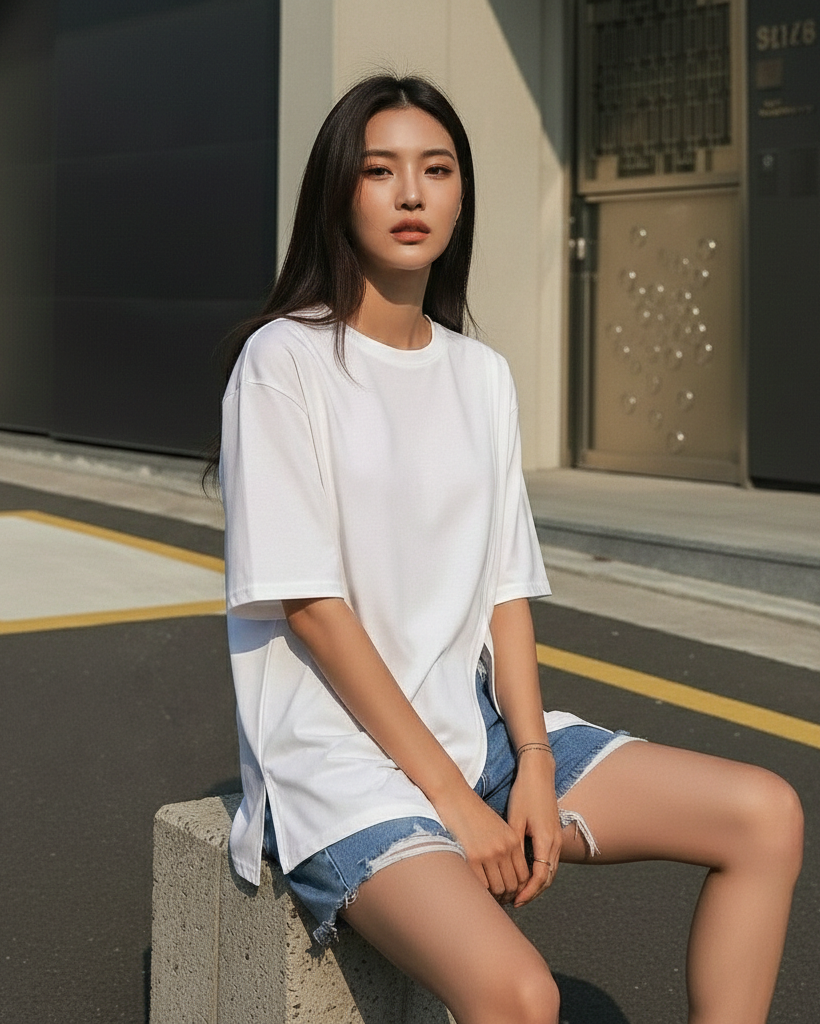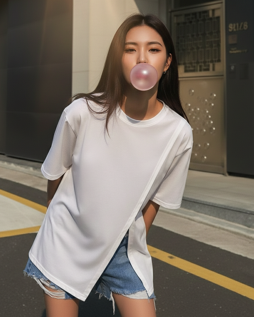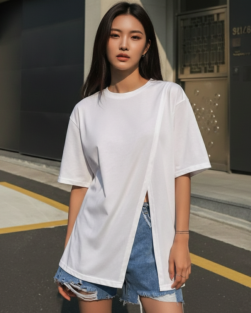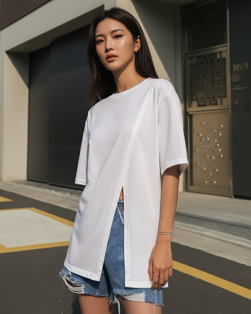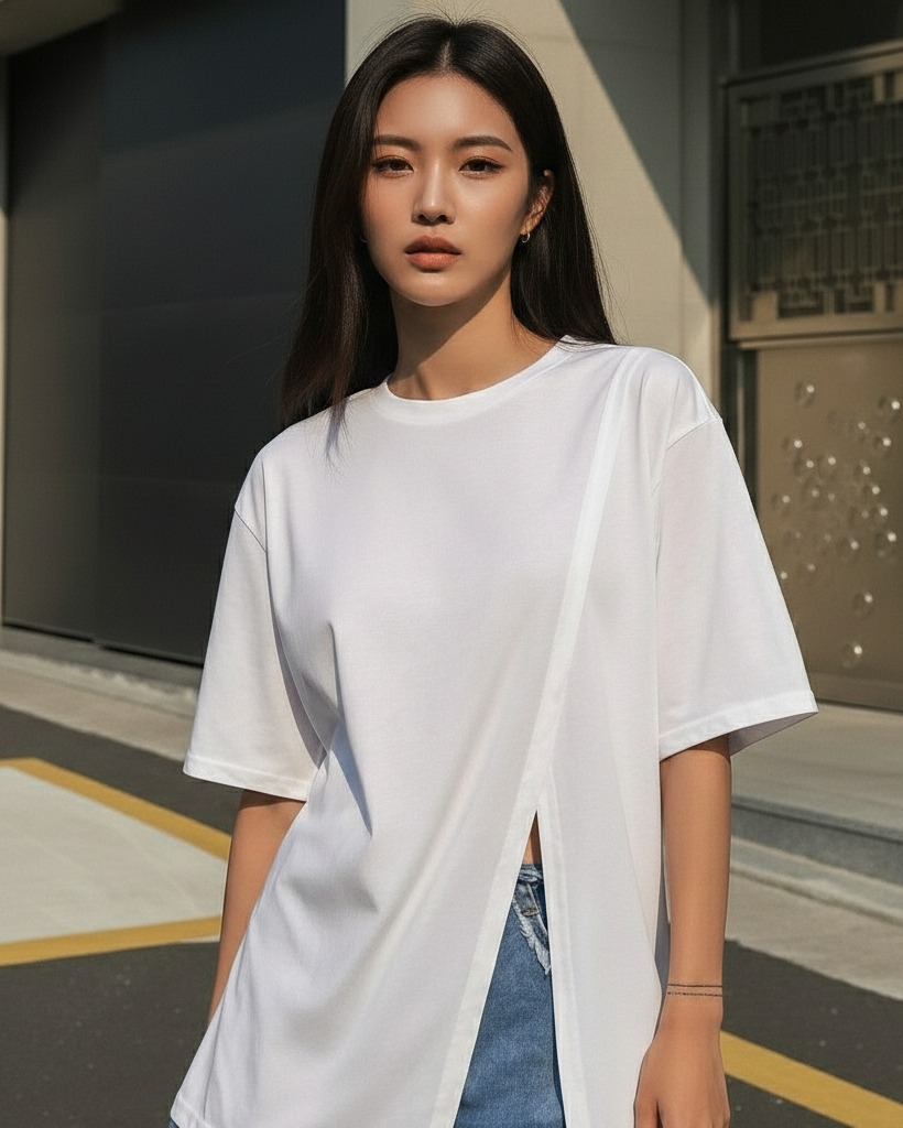 A modern essential elevated with an asymmetric front split detail. Designed in a relaxed silhouette with a clean neckline and fluid drape, this tee brings subtle structure and standout simplicity to everyday styling.