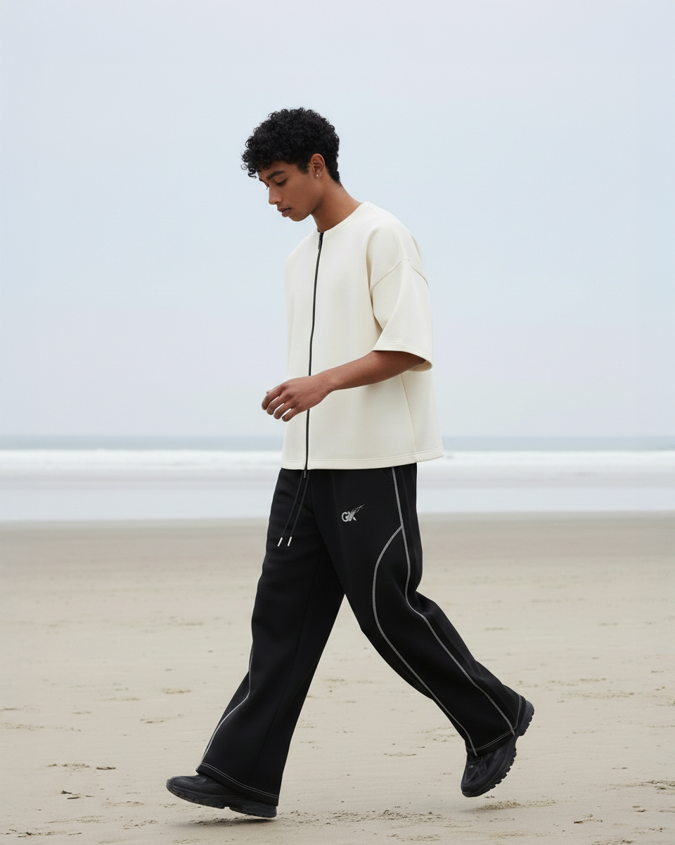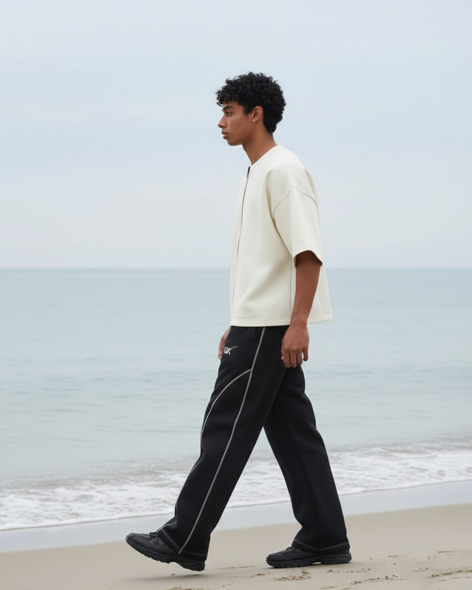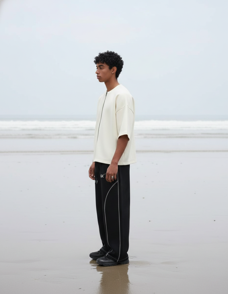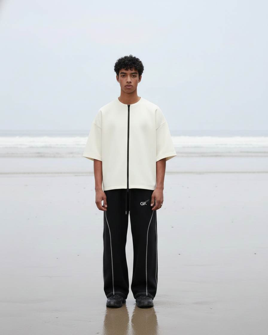 A refined essential designed for movement and stillness. The Coastline Core Set features a structured zip-front top paired with fluid track pants, balanced in monochrome tones. Minimal detailing, relaxed proportions, and technical seams create a silhouette that feels effortless—whether worn by the sea or in the city.