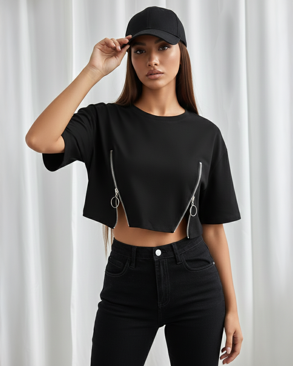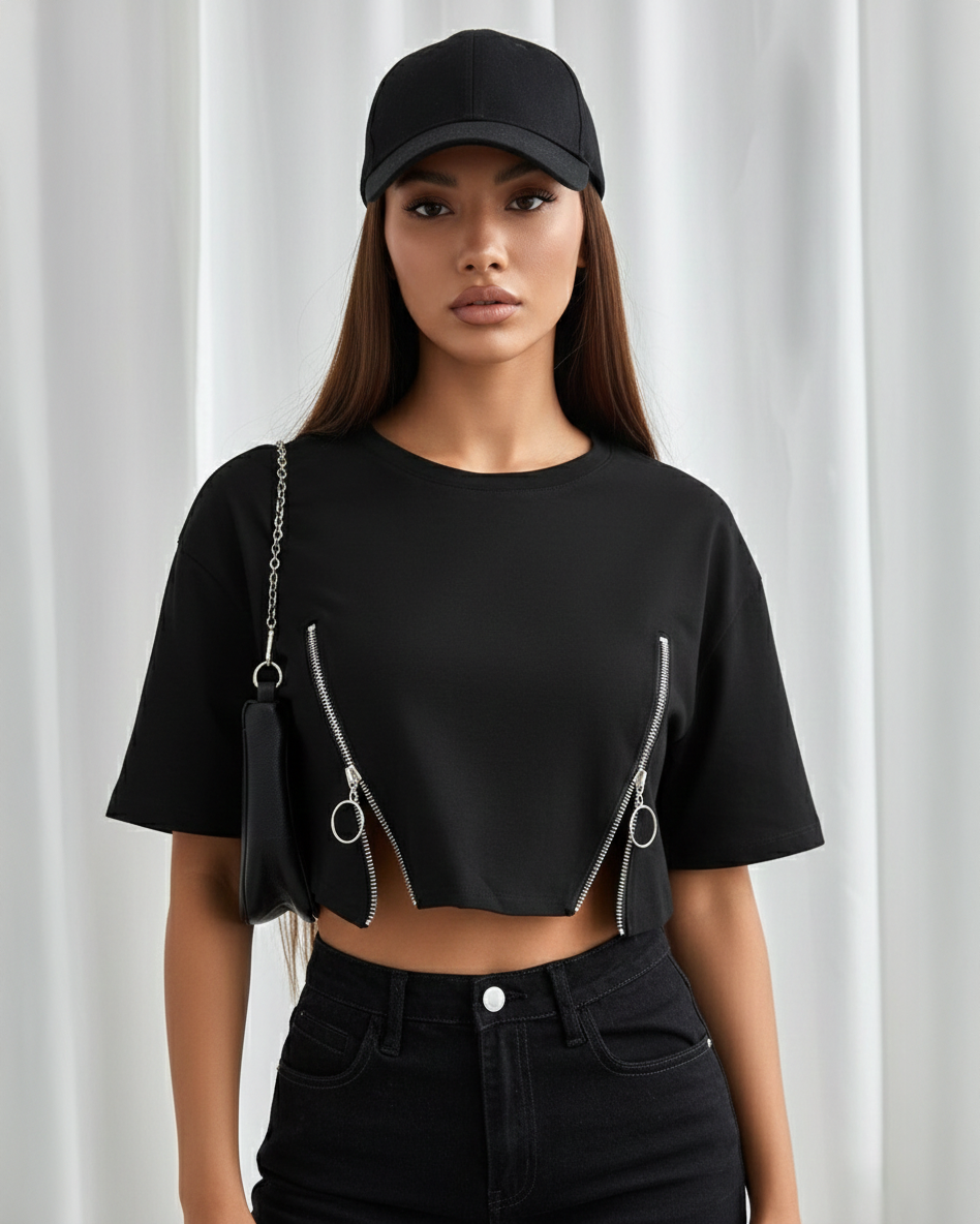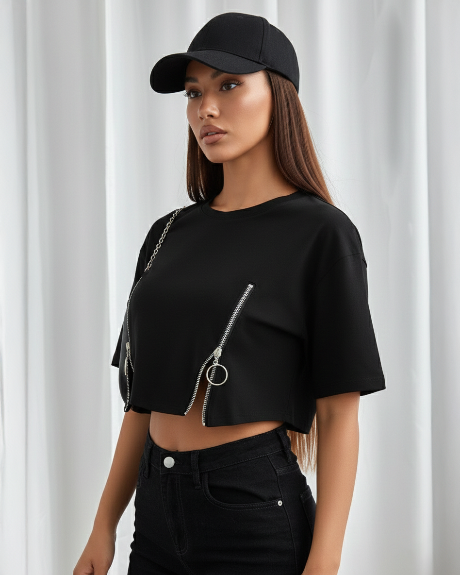 A modern cropped tee designed with dual exposed zip details and metal ring pulls for a sharp, utility-inspired edge. Cut in a structured silhouette with a clean neckline, it blends street attitude with refined minimalism.