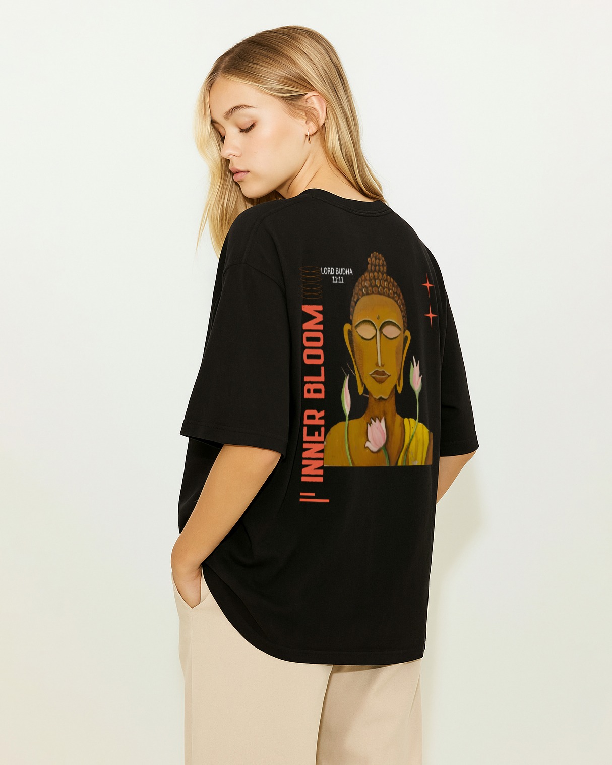 Step into a moment of calm with the “11:11 Inner Bloom” Oversized T-Shirt. Crafted from premium 100% cotton, this black tee features a minimalist 11:11 design on the front and a bold back graphic of Lord Buddha surrounded by blooming lotus flowers—symbolizing mindfulness, peace, and growth.