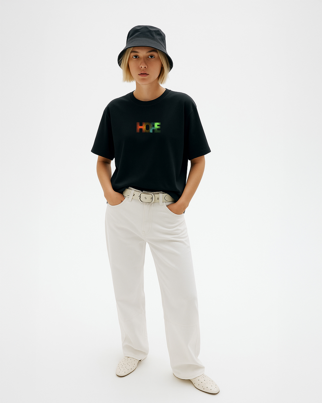 Front: “HOPE” text in multicolor print
