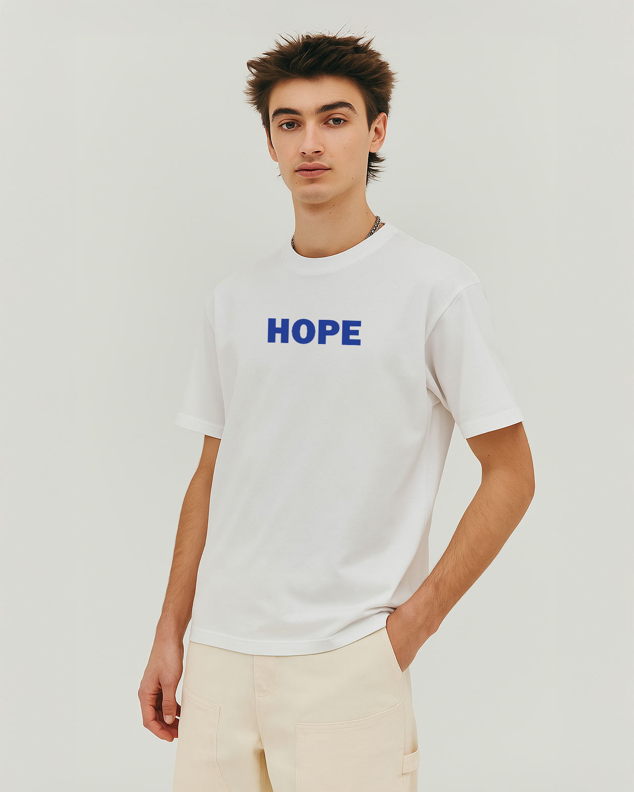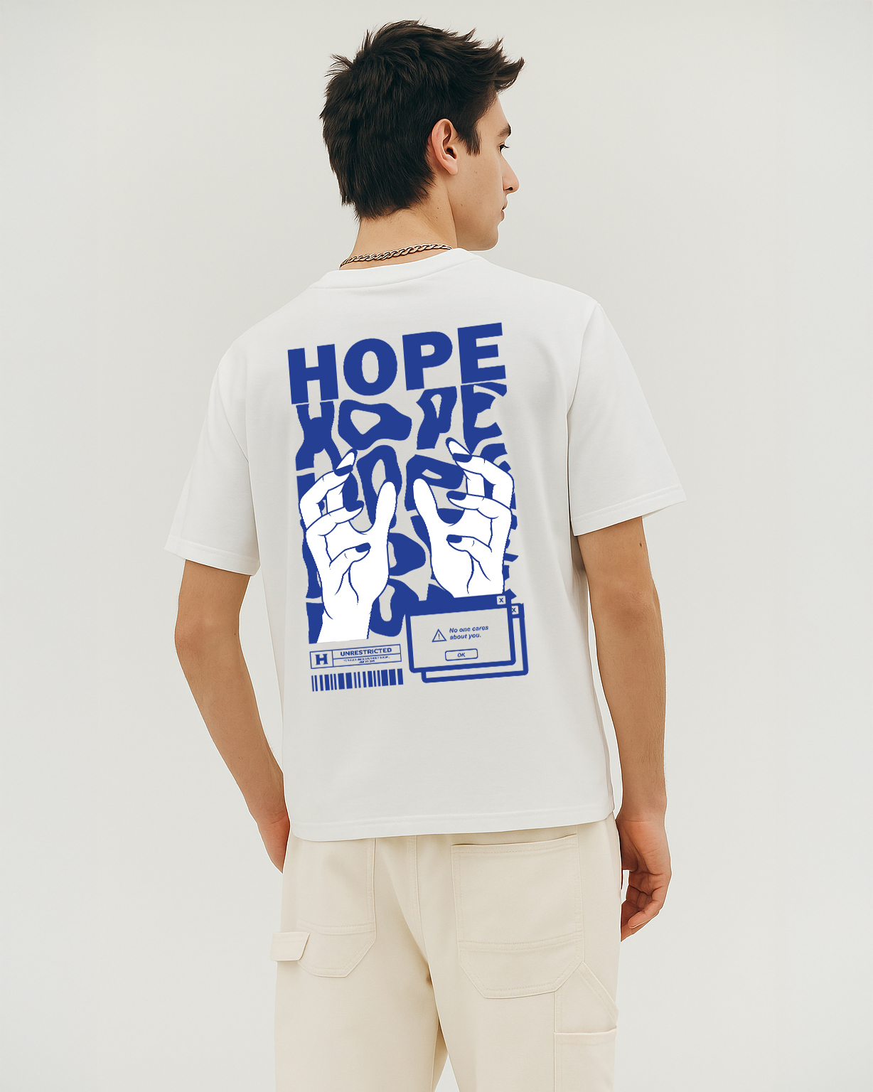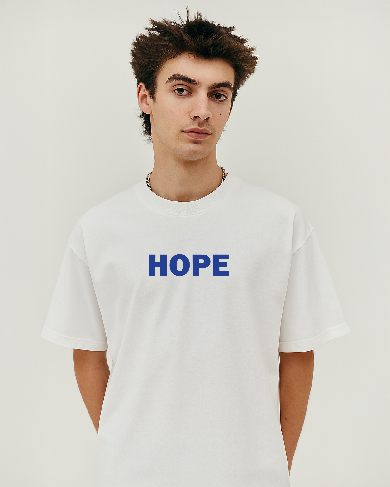 Step into purpose with the “HOPE” White Oversized T-Shirt – a powerful blend of comfort and design. Crafted from 100% pure cotton, this breathable and ultra-soft tee features a bold “HOPE” print on the front and a striking blue graphic design on the back, showcasing expressive hands surrounded by layered “HOPE” typography. The oversized fit offers a relaxed silhouette that flatters all body types and ensures day-long comfort.