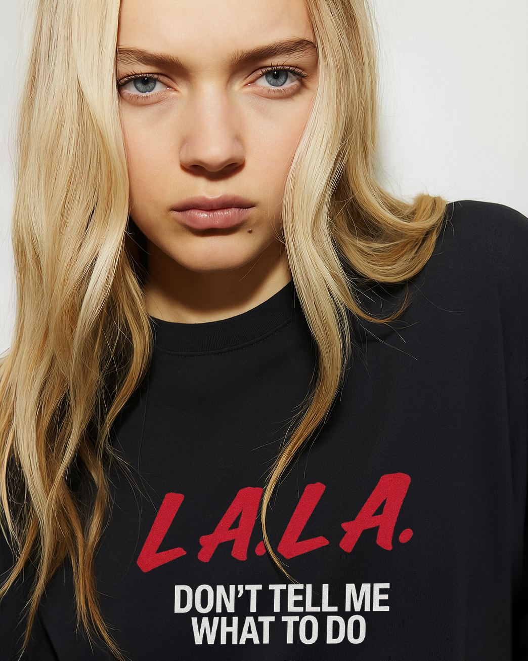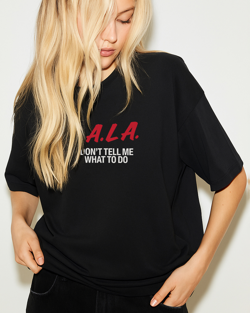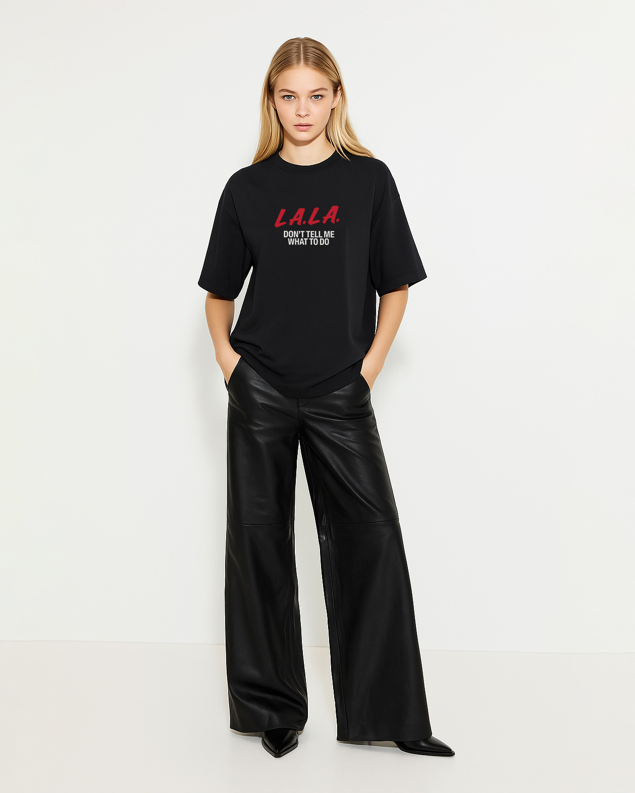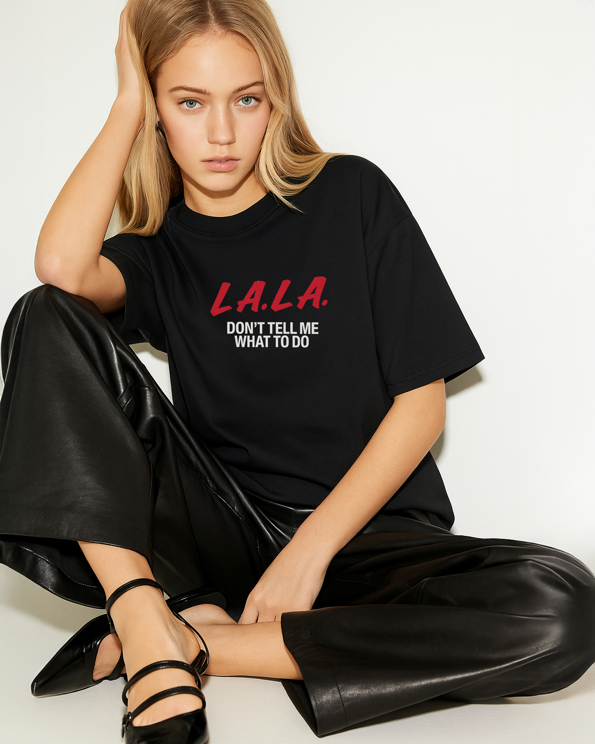 Speak your mind with this bold L.A.L.A. statement tee. Crafted from 100% breathable cotton, this black oversized T-shirt features powerful typography in vibrant red and white that reads: “L.A.L.A. DON’T TELL ME WHAT TO DO.”Designed for those who own their attitude and wear it unapologetically.