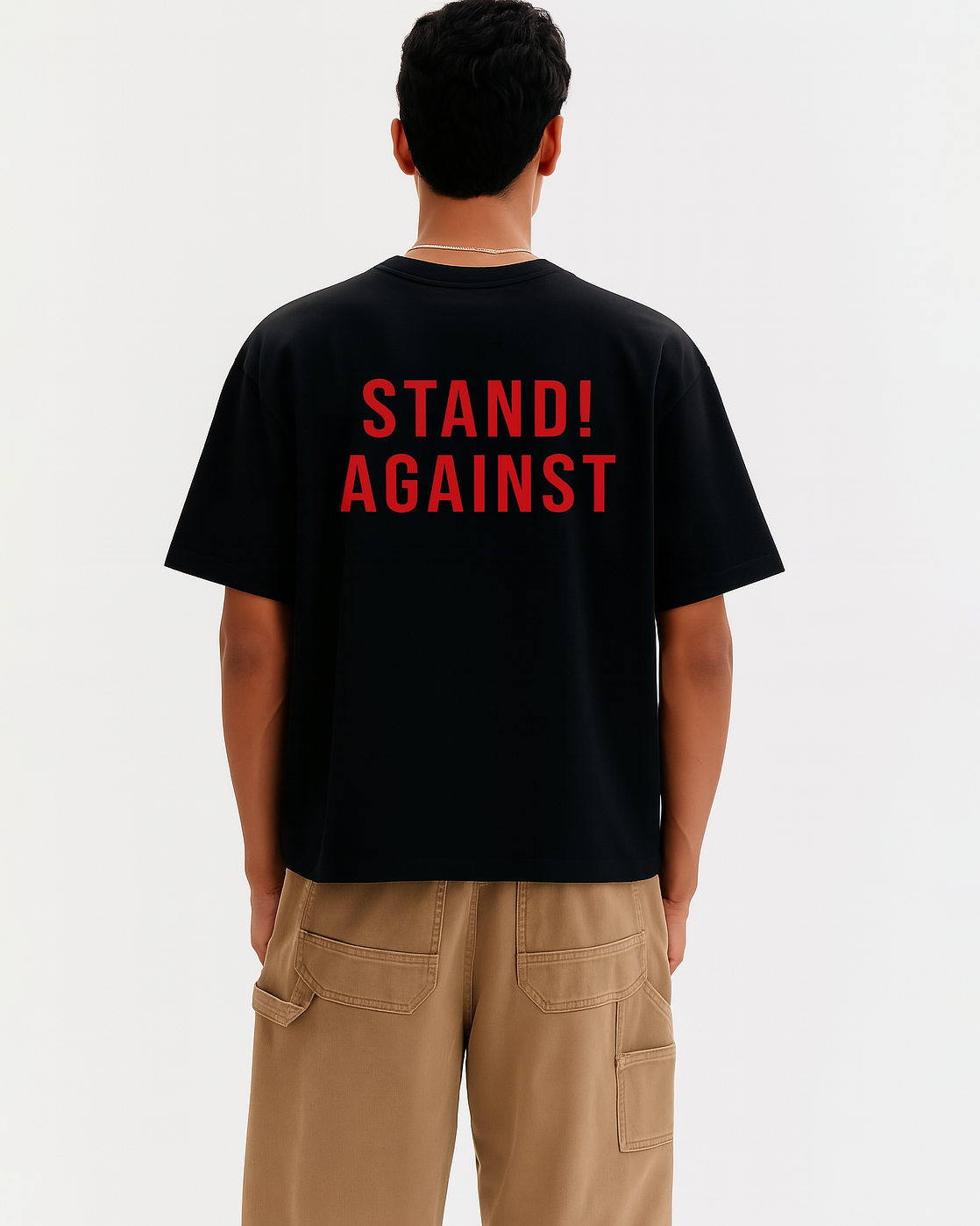 Back print: “STAND! AGAINST” — a call to action