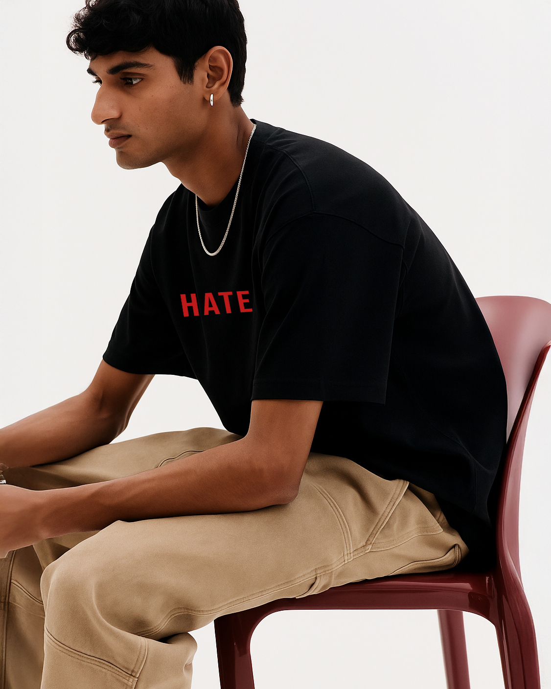 Front print: “HATE” in bold red font