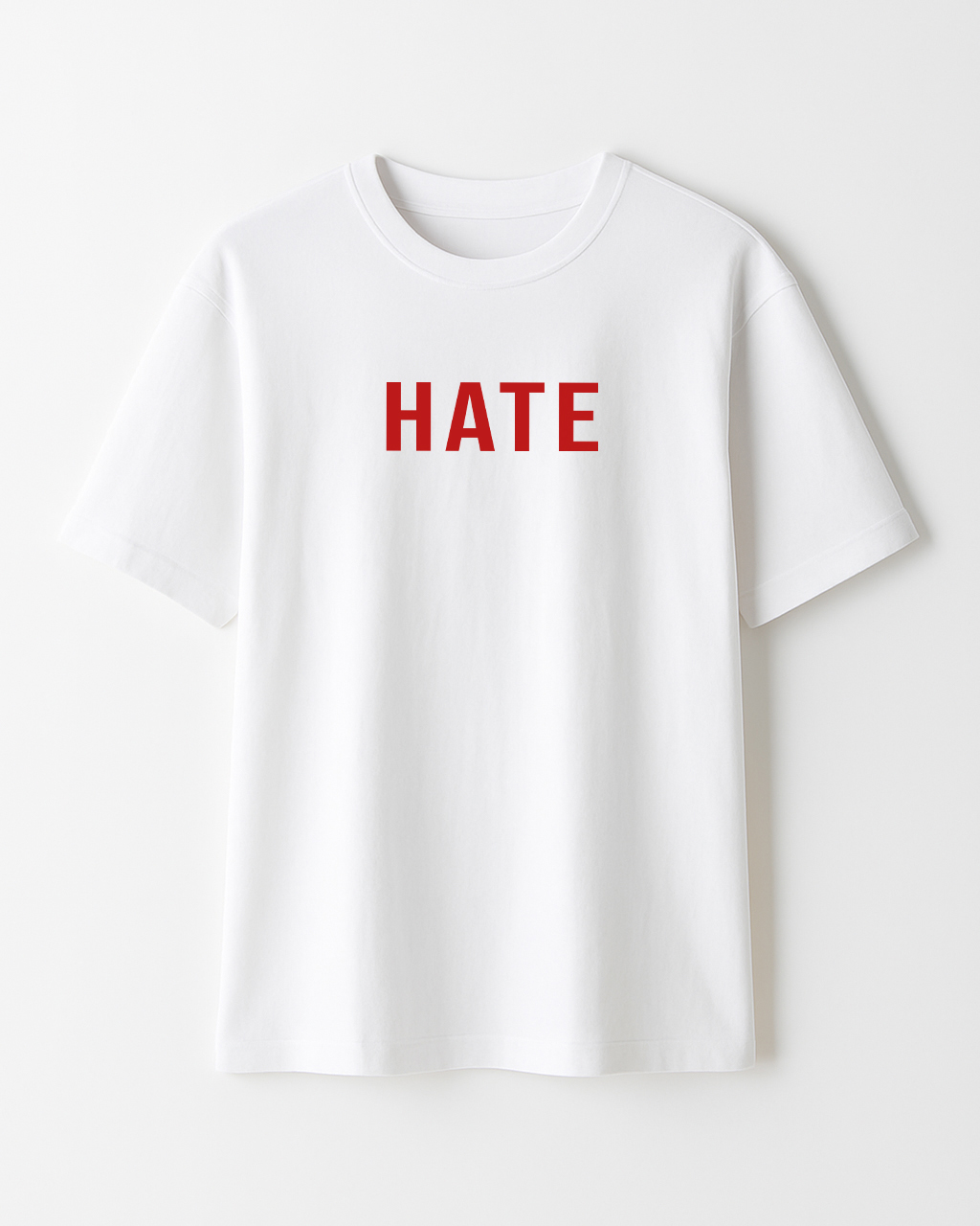 Front print: “HATE” in bold red