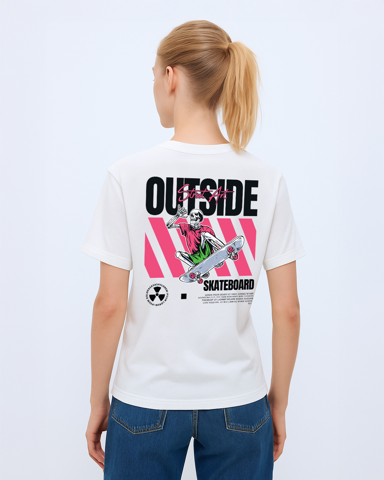 The front features a clean “Street Art” script in vibrant pink, while the back showcases a striking street-inspired illustration of a skeleton skater riding out the chaos – an ode to fearless expression and movement. Eye-catching pink geometric elements and skateboarding motifs complete the look.