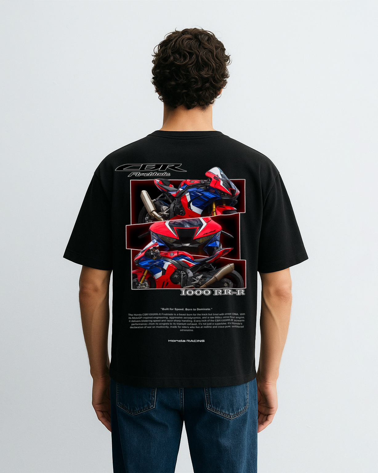 Crafted from 100% breathable cotton, this oversized T-shirt blends comfort with bold automotive style. Featuring a striking CBR FireBlade graphic on the back and a clean Honda Racing logo on the front, it’s the perfect pick for car enthusiasts and streetwear lovers alike.