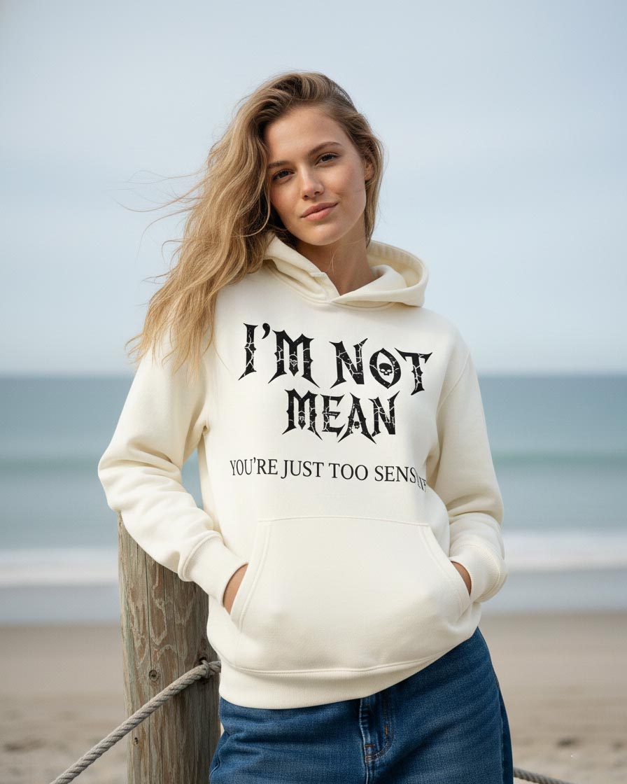 Step into your unapologetic era. This premium cream hoodie features a bold gothic “I’M NOT MEAN – YOU’RE JUST TOO SENSITIVE” print, designed for those who say it like it is.