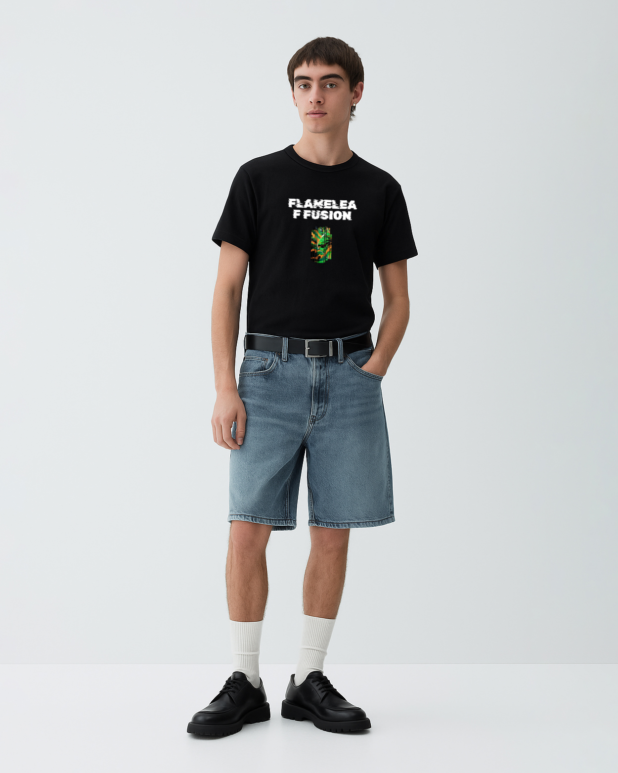 Turn up the streetwear energy with this bold black cotton T-shirt featuring the abstract “FLAMELEA F FUSION” graphic design. With its vibrant, artistic leaf-inspired print at the center and striking text above, this tee effortlessly blends creativity with comfort. Whether you’re pairing it with shorts or jeans, it’s made to stand out while keeping you cool.
