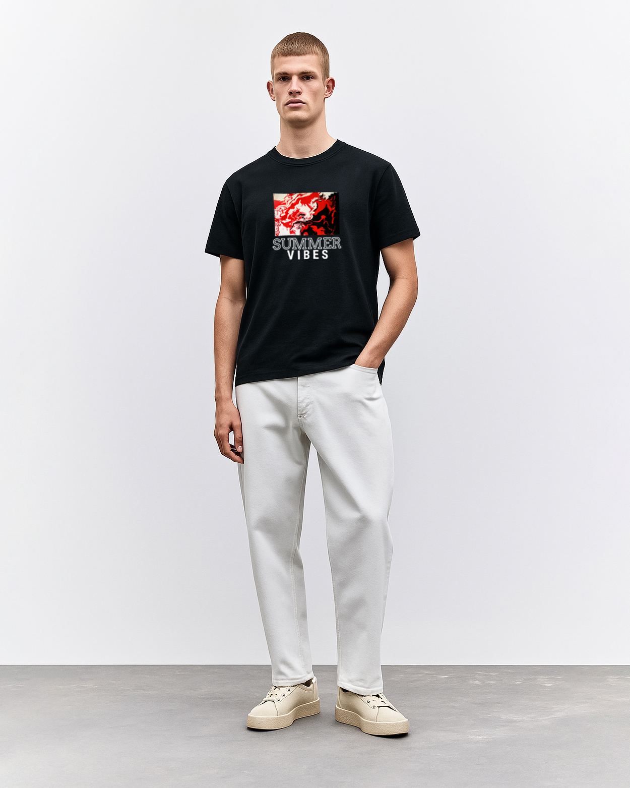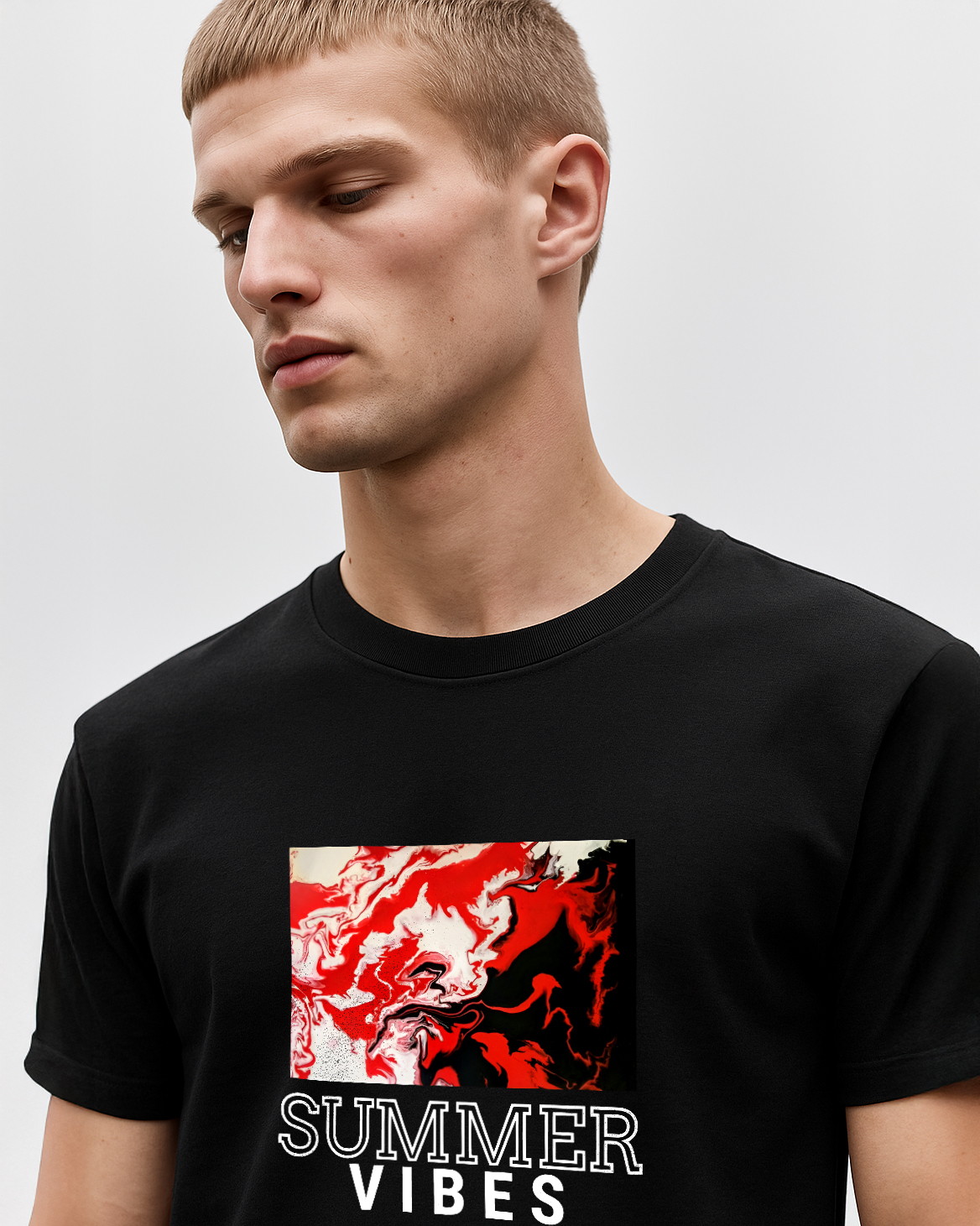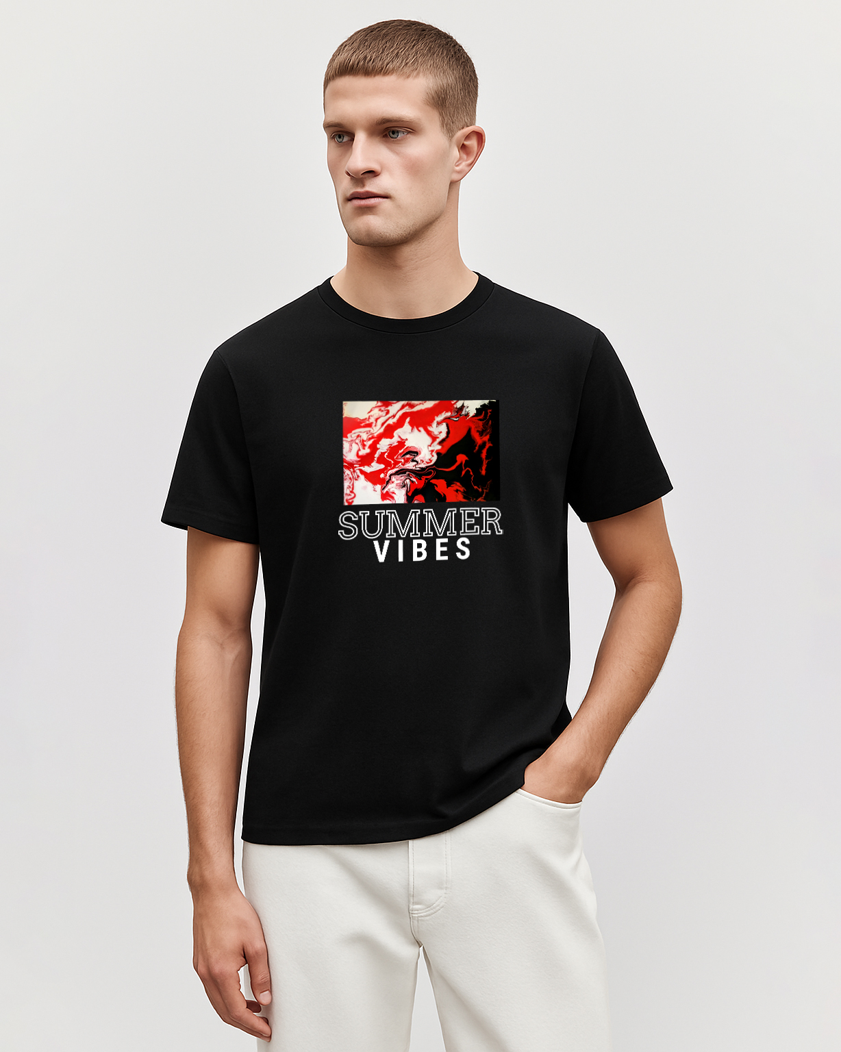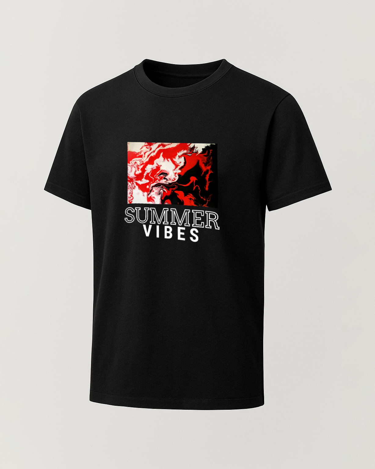 Turn up the heat with this bold black cotton T-shirt featuring an abstract red and white graphic paired with the phrase “SUMMER VIBES.” Perfect for beach days, casual strolls, or just soaking up the season in style, this tee brings energy and attitude to your summer wardrobe. Crafted from 100% pure cotton, it’s breathable, durable, and built for all-day comfort.