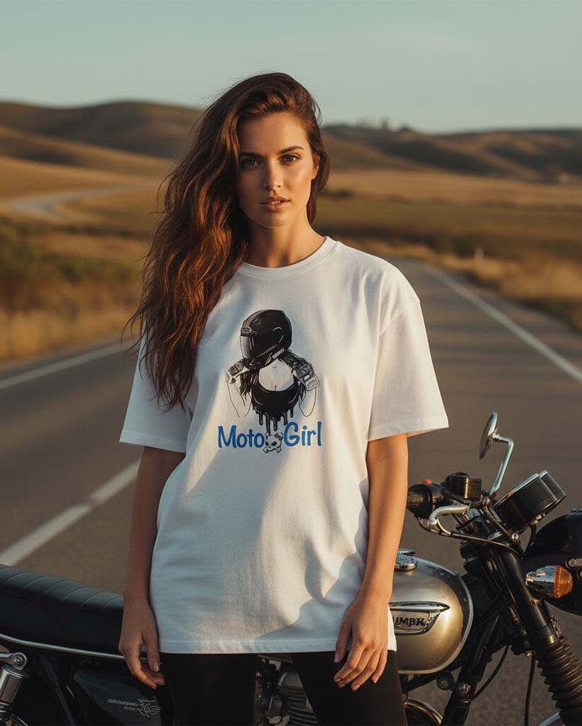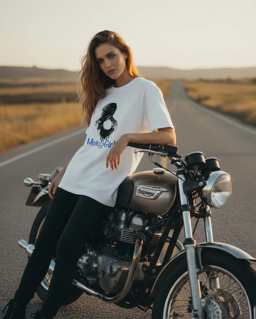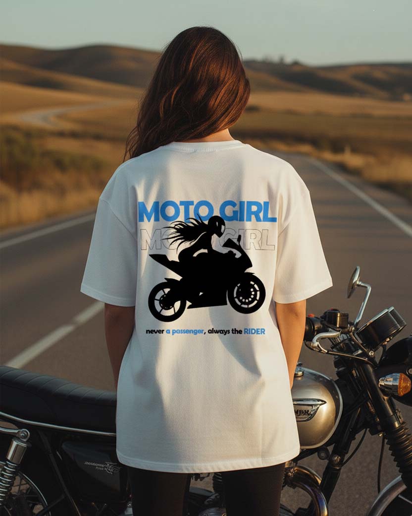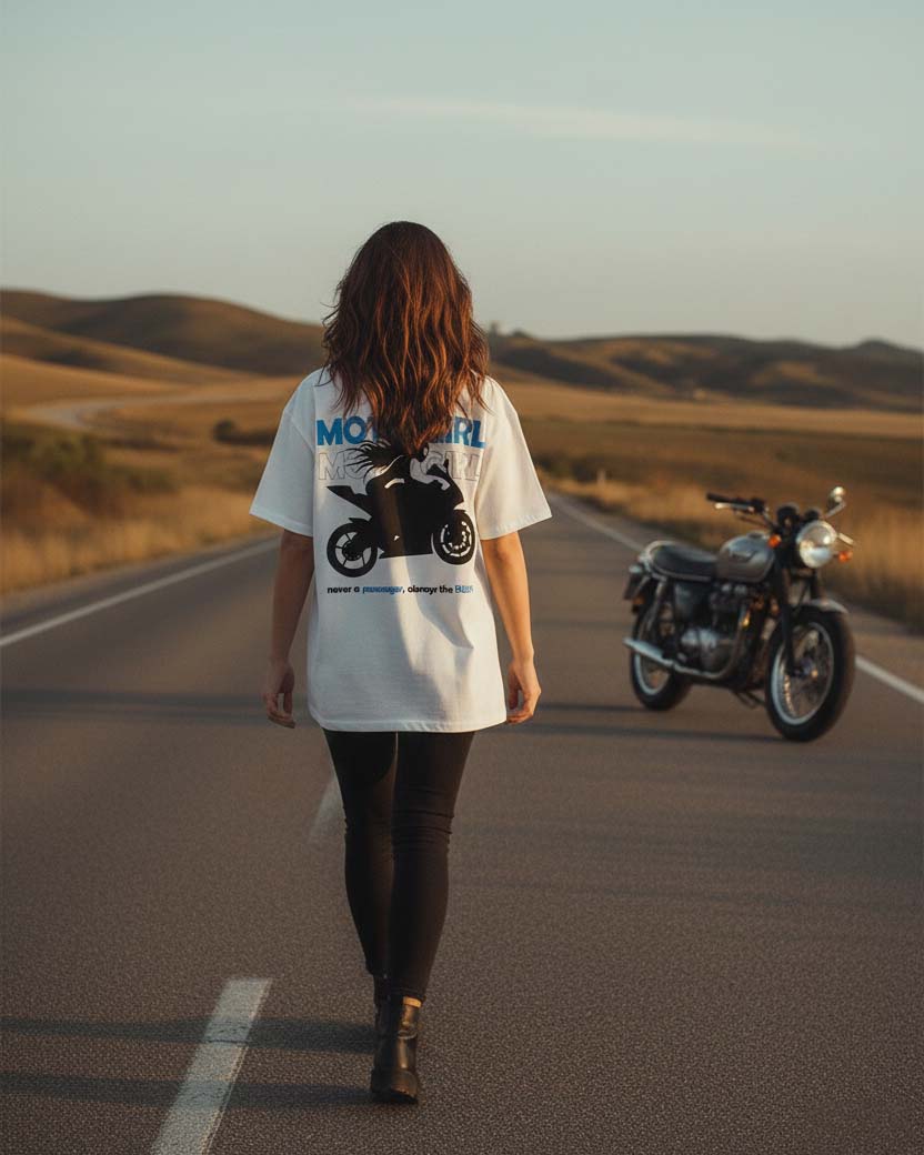 The Moto Girl T-Shirt features a bold back graphic of a fearless female rider paired with the statement: “never a passenger, always the rider.” Designed to celebrate independence, confidence, and road-ready attitude.