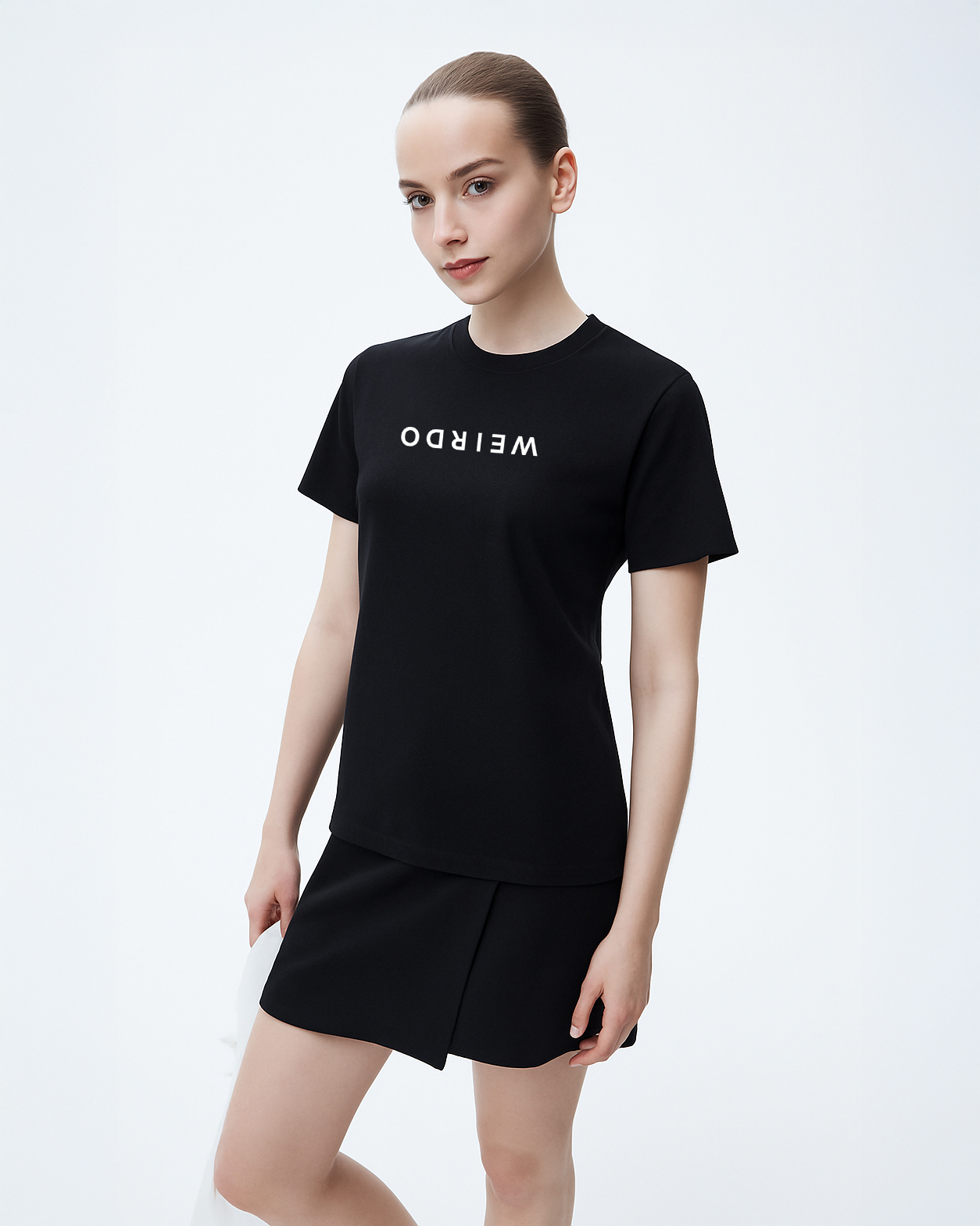 Women’s Black Cotton T-Shirt – Upside Down “WEIRDO” Graphic | Bold & Playful Fit