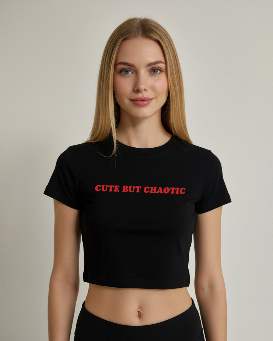 Elevate your essentials with this sleek and versatile black crop top featuring a cleanWomen’s Black Graphic Crop Top – “Cute but Chaotic” graphic in contrasting white. Made from 100% premium cotton, this top offers a soft, breathable feel with a structured fit that flatters your silhouette. The minimalistic design and classic crew neckline make it an effortless piece for everyday wear — whether you’re lounging, heading to the gym, or styling it up for a casual day out.