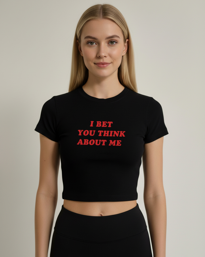 Elevate your essentials with this sleek and versatile black crop top featuring a cleanWomen’s Black Graphic Crop Top – “I bet you think about me” graphic in contrasting white. Made from 100% premium cotton, this top offers a soft, breathable feel with a structured fit that flatters your silhouette. The minimalistic design and classic crew neckline make it an effortless piece for everyday wear — whether you’re lounging, heading to the gym, or styling it up for a casual day out.