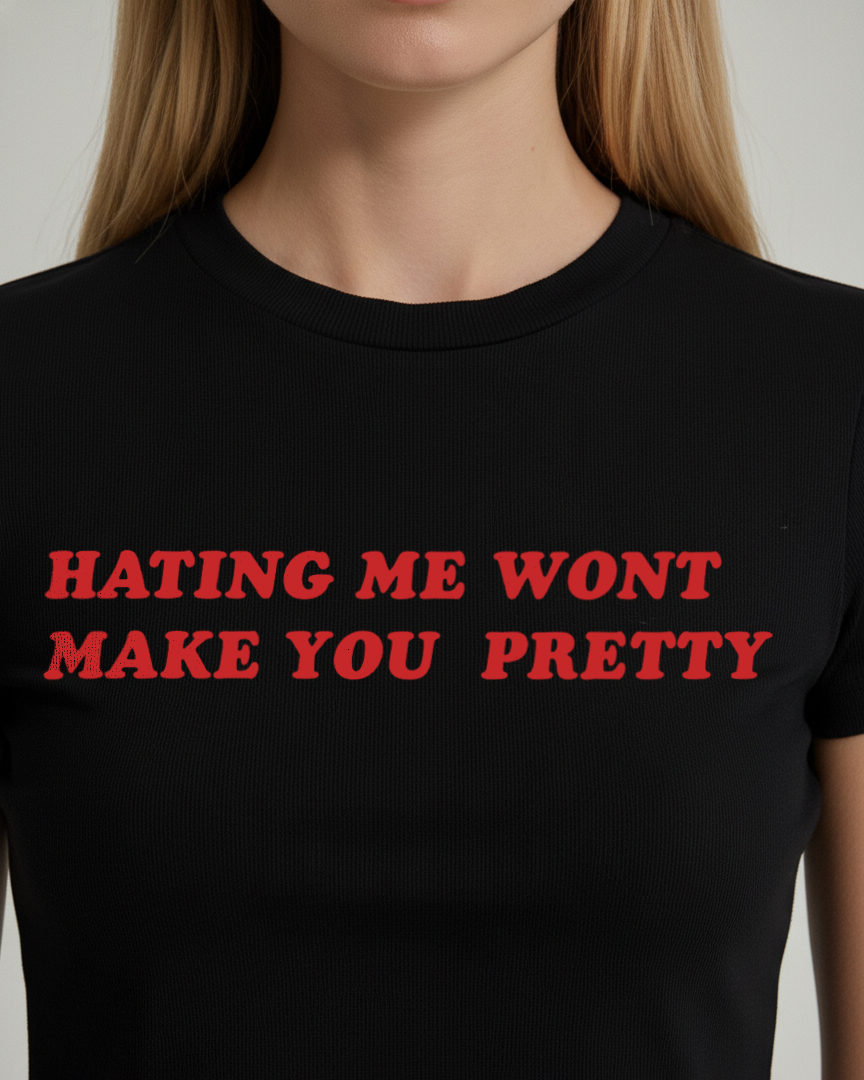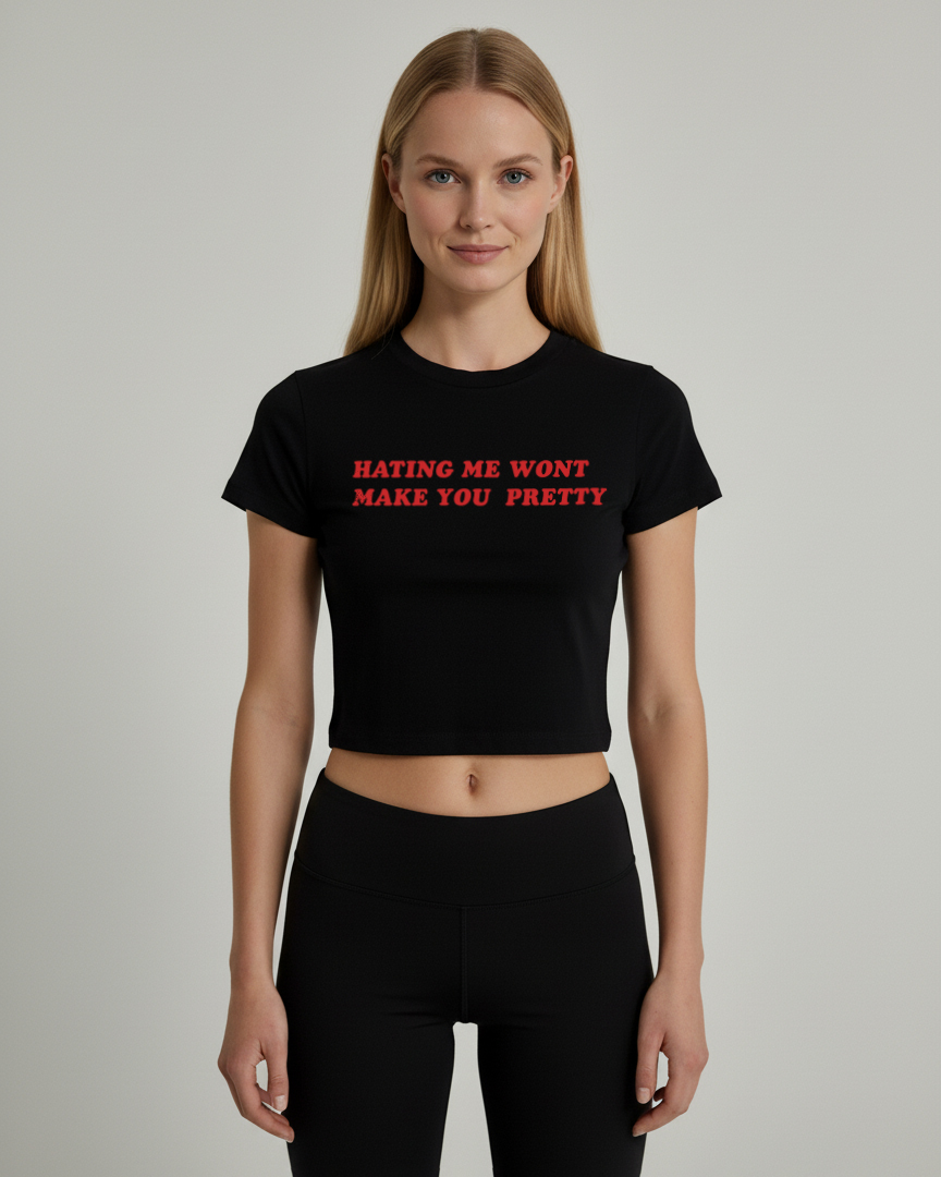Elevate your essentials with this sleek and versatile black crop top featuring a clean “Hating Me Won’t Make You Pretty” graphic in contrasting white. Made from 100% premium cotton, this top offers a soft, breathable feel with a structured fit that flatters your silhouette. The minimalistic design and classic crew neckline make it an effortless piece for everyday wear — whether you’re lounging, heading to the gym, or styling it up for a casual day out.
